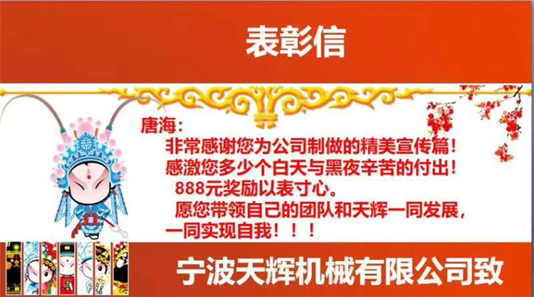 為鼓勵天輝機械員工的主人翁精神!特為一直為公司宣傳視頻付出努力的技術(shù)負責人唐海準備了一封現(xiàn)金紅包獎勵,以此感謝他為公司的付出!